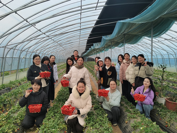 走出博物馆,来到生机勃勃的草莓采摘园,开启踏青采摘之旅。暖棚内绿意盎然、果香四溢,鲜红饱满的草莓缀满藤蔓。女职工们手提果篮,穿梭于垄间,精心挑选、细心采摘,一边品尝鲜甜草莓,一边畅谈欢笑,欢声笑语回荡在田间地头。在清新的田园气息中,大家舒缓了压力、放松了身心,增进了情谊,现场洋溢着温馨和谐、轻松愉悦的浓厚氛围,尽情享受春日田园的惬意与美好。